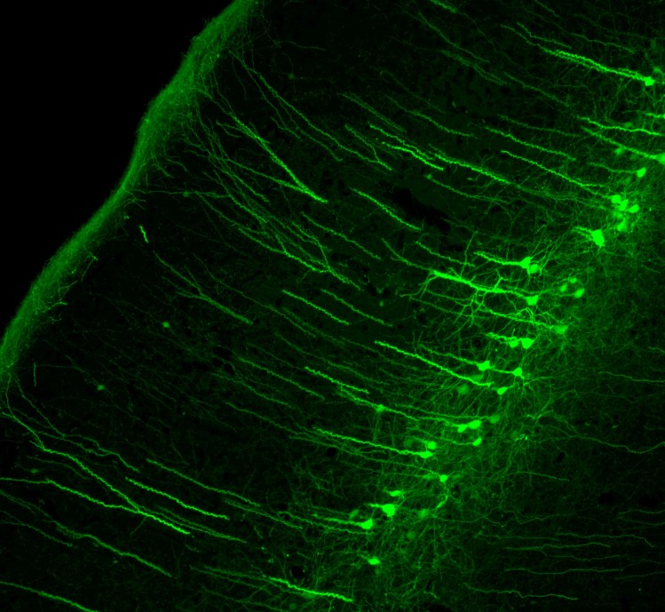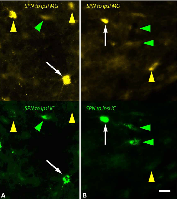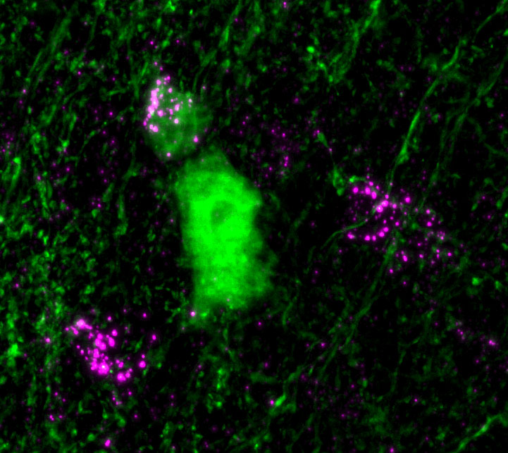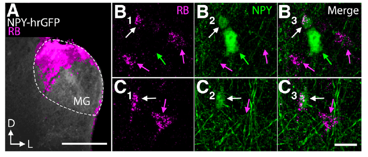 A cell expressing neuropeptide Y (green) also projects to the medial geniculate nucleus (magenta)