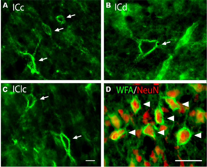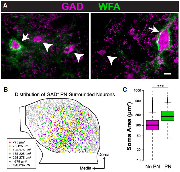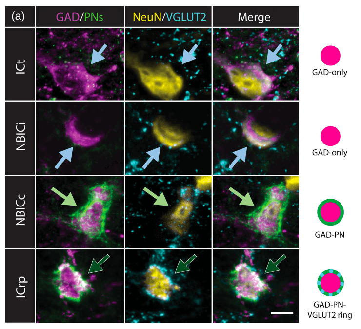A GABAergic cell (magenta) in the rostral pole of the inferior colliculus is surrounded by glutamatergic boutons (cyan) and a perineuronal net (green)