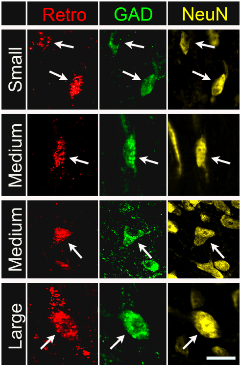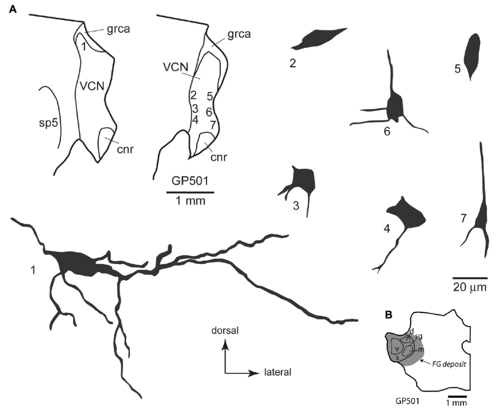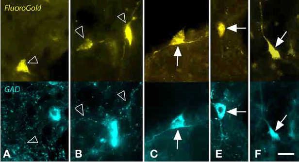 Types of Inhibitory Cells: Inhibitory neurons that use GABA or glycine as a neurotransmitter play key roles throughout the auditory system. Another area of emphasis in our lab focuses on several questions about these inhibitory cells: 1) are there specific molecular markers that distinguish subtypes of inhibitory cells that serve different functions in hearing? 2) do top-down circuits have direct connections with the inhibitory cells? 3) do cholinergic circuits have direct connections with the inhibitory cells?