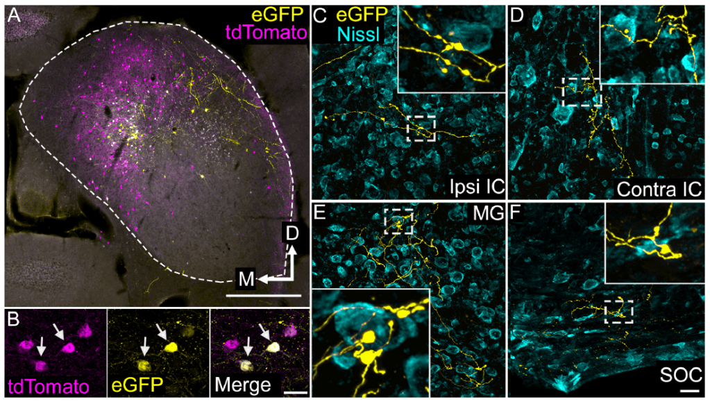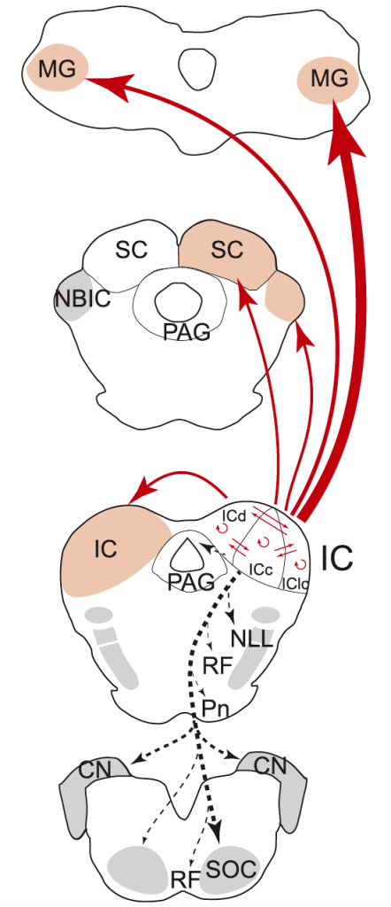 Descending Auditory Pathways: A major advance over the past 25 years has been the discovery of extensive pathways from auditory cortex to many lower brainstem auditory regions. Many of our studies have focused on identifying the auditory circuits that are contacted directly by the descending projections from auditory cortex. Another important focus of this work is the interaction between descending auditory pathways and neuromodulatory pathways.