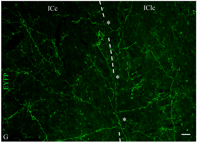 Cholinergic axons in the inferior colliculus are labeled with a chemically-selective viral tract tracing technique.
