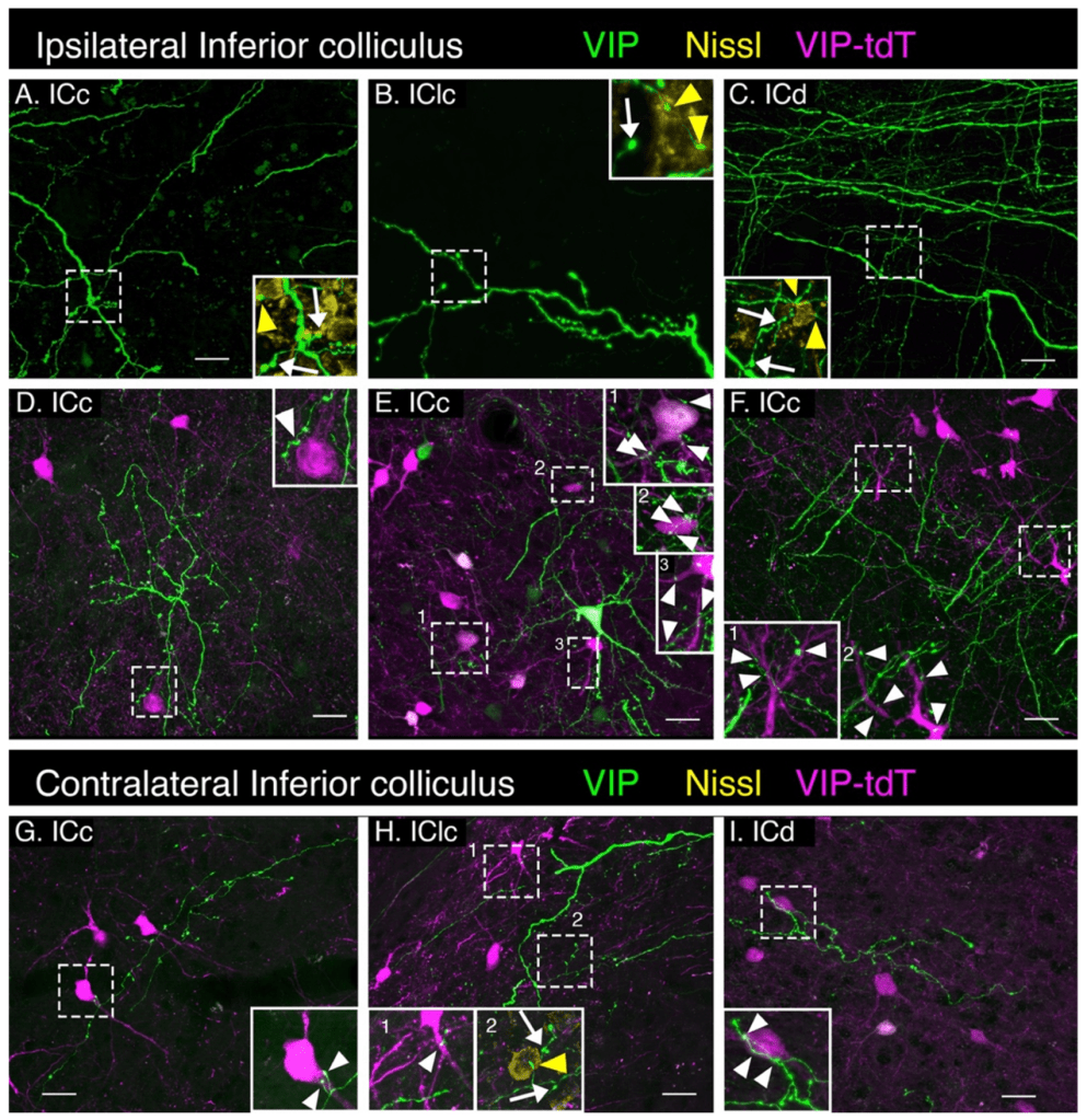 Circuitry of Subclasses of Inferior Colliculus Cells: Recent collaborative work with the Roberts lab has shown that two markers, vasoactive intestinal peptide, or VIP, and neuropeptide Y, or NPY, can be used to identify distinct subclasses of cells in the inferior colliculus, an auditory hub. We are working to understand what brain regions send inputs to these cell types, and to find out what brain regions these cell types send projections to.